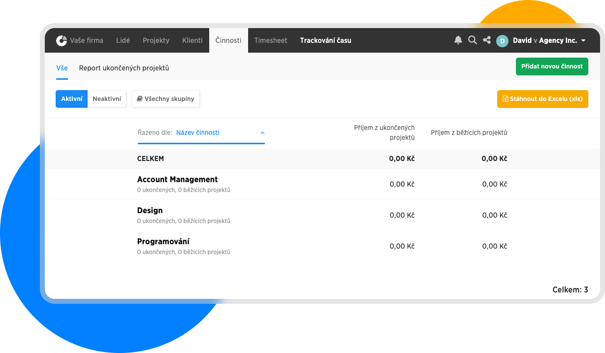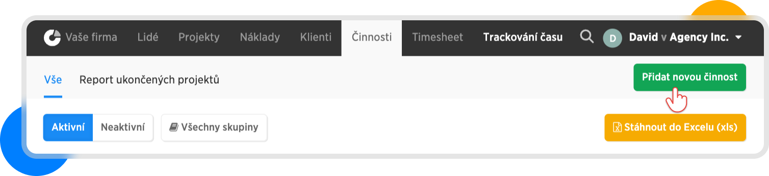 V horním menu vyberte záložku Činnosti a následně vpravo klikněte na Přidat novou činnost.