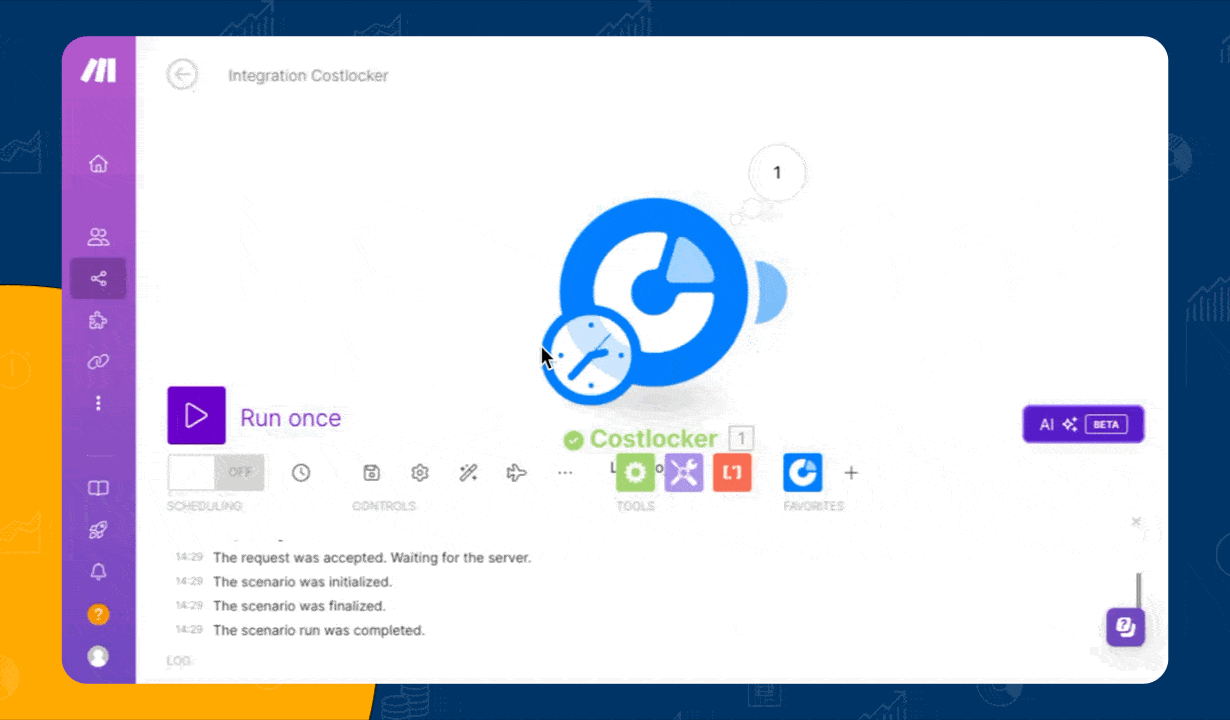 Klikněte na tlačítko Run once (Spustit) pro okamžité spuštění scénáře. Vaše data z Costlockeru by se měla ihned začít načítat do vaší Tabulky Google.