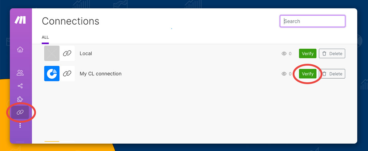 Klikněte na Connections (Připojení) a uvidíte své nově vytvořené připojení. Pro ověření jeho funkčnosti klikněte na zelené tlačítko Verify (Ověřit)