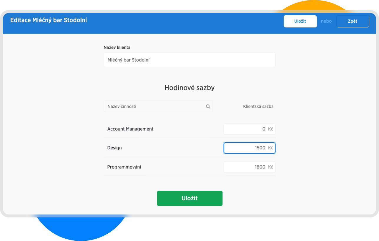Následně se nám zobrazí formulář pro editaci. Zde stačí vyplnit Klientské sazby pro jednotlivé činnosti a potvrdit tlačítkem uložit.