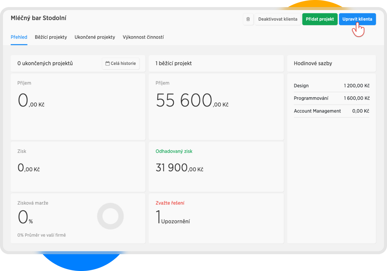 Pro vysvětlení: Při následující tvorbě rozpočtu pro klienta Mléčný bar Stodolní, se při přidání činnosti Design předvyplní Klientská sazba na částku 1500 Kč.