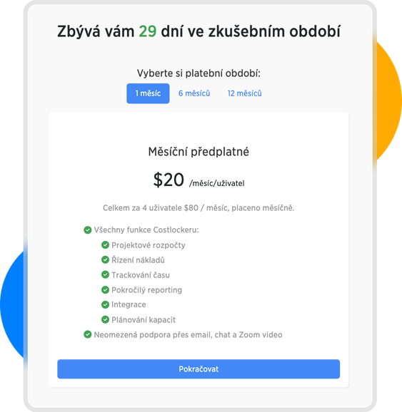 Po založení společnosti začne běžet automaticky 30 denní zkušební období, kdy budete moci využívat Costlocker zdarma a bez jakýchkoliv omezení. Následně se pak můžete rozhodnout, zda přejdete na placenou verzi. Veškerá data ze zkušebního období vám zůstanou zachována.