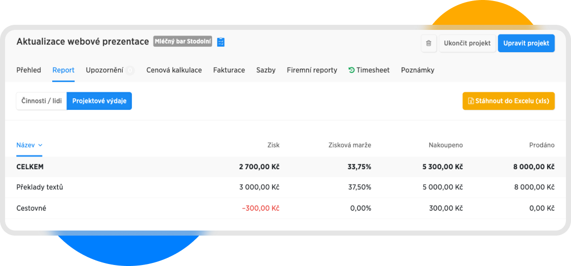 Report projektové výdaje nám ukazuje ziskovost externích nákladů na projektu.