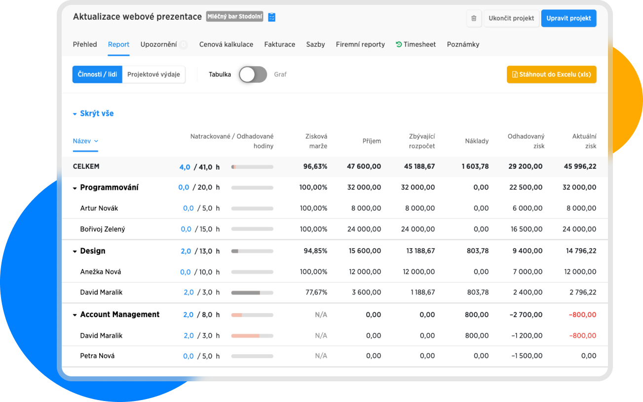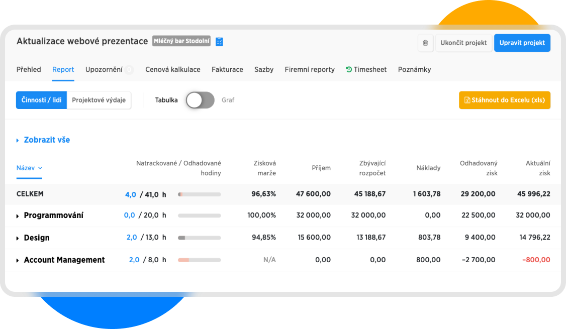 Report dává základní přehled ohledně ziskovosti jednotlivých činnosti a osob na projektu.