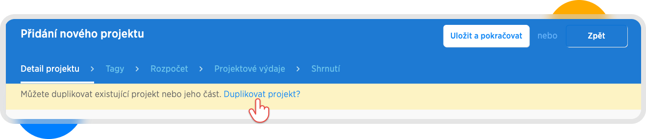 Následně se nám pod menu Přidání nového projektu zobrazí žlutý pruh - zde klikneme na tlačítko Duplikovat projekt?
