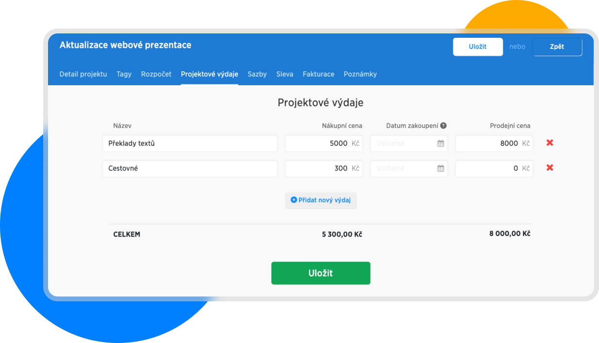 Zde vidíme že celkový náklad projektu je 5 300,- zatímco náš příjem bude 8 000 Kč.