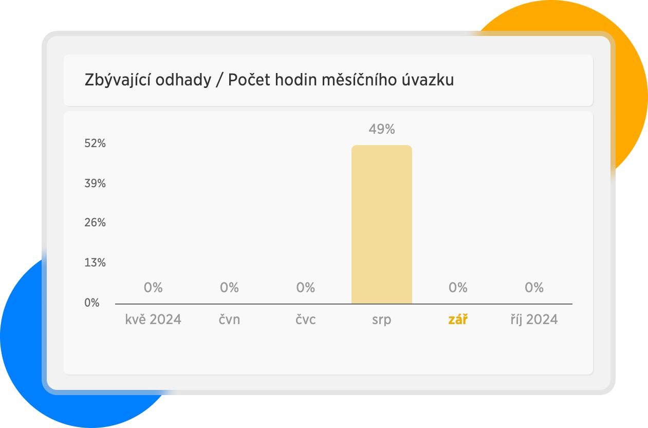Třetí graf reportu nám ukazuje, kolik % hodin zbývá v odhadech vůči Počtu hodin měsíčního úvazku. Pokud tedy odpracujeme v daném měsící úplně všechny naplánované hodiny, číslo bude 0%.