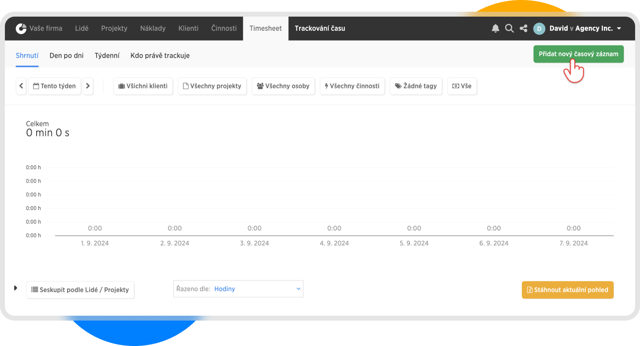 V horním menu vybereme záložku Timesheet a následně vpravo klikneme na Přidat nový časový záznam.
