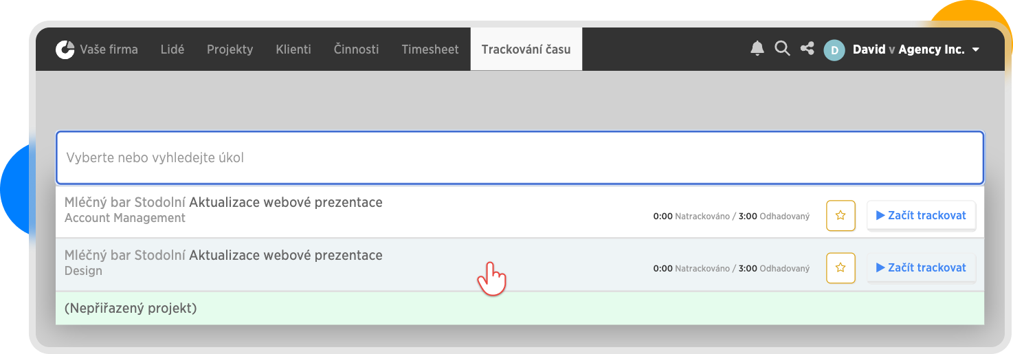 V položce Vyberte nebo vyhledejte úkol vyhledáme položku, do které chceme zatrackovat čas. (Musíte být přiřazeni v nějakém rozpočtu projektu.)