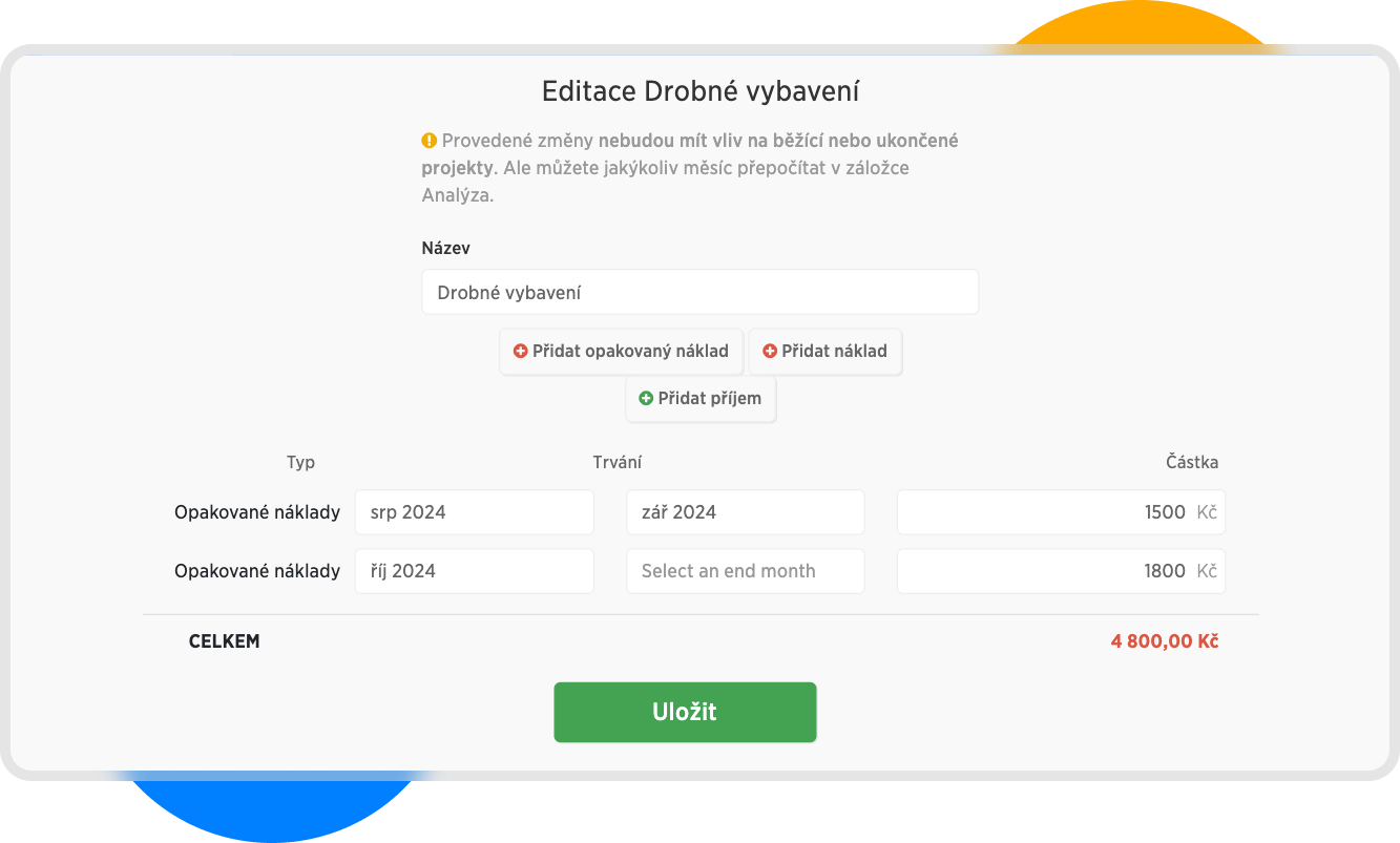 Opakovaný náklad se opakuje každý měsíc. Ideální pro většinu nákladů jako je pronájem kanceláří, leasing na auta apod.